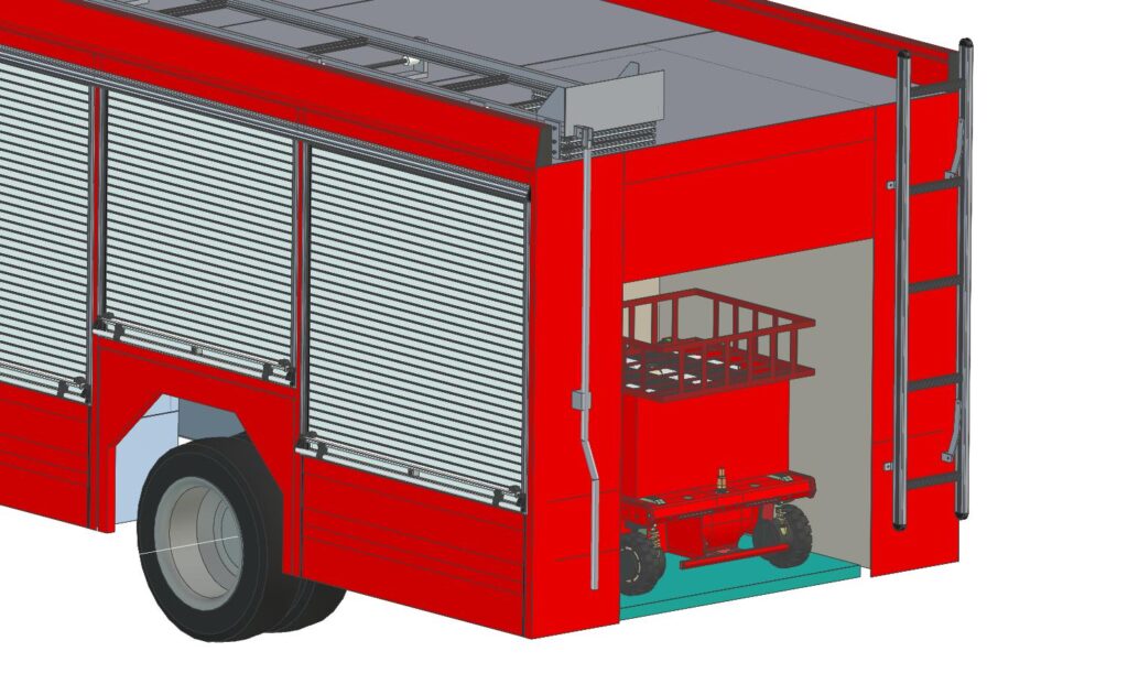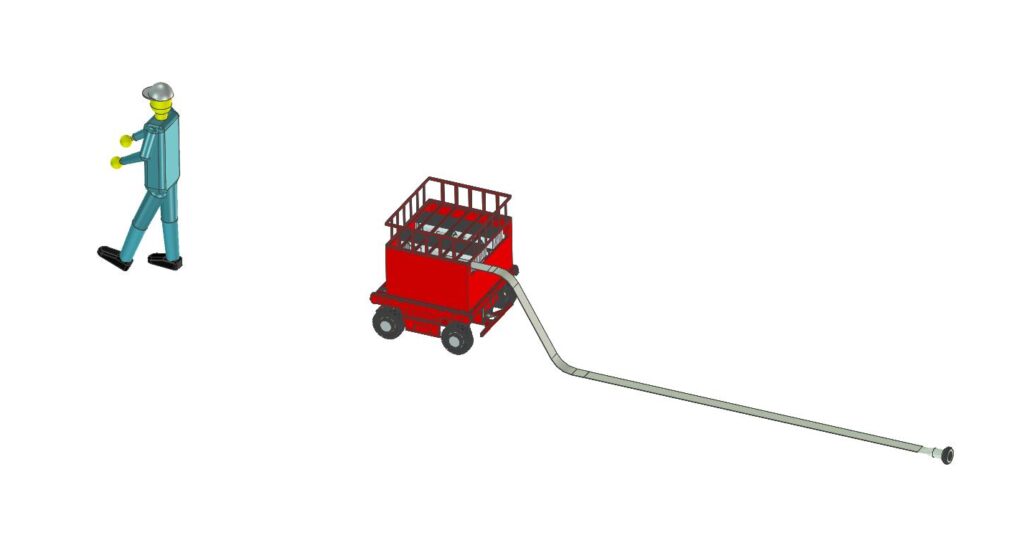 この搬送車はホースレイヤーとして使用することは勿論のこと、ホースを敷設した後は火災現場での消防資機材の搬送に使用できます。さらに車両上部のユニットを載せ替えることで遠隔操作ノズルや遠隔操作照明灯として使用することが出来ます。また消防活動が終わった後は敷設したホースの回収も行うことも出来ます。